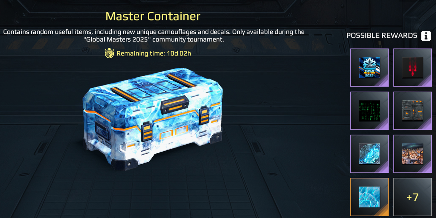 To celebrate Global Masters 2025, the Master Container has been added to the game, featuring both new exclusive cosmetic items and popular camouflages highly rated by our players.