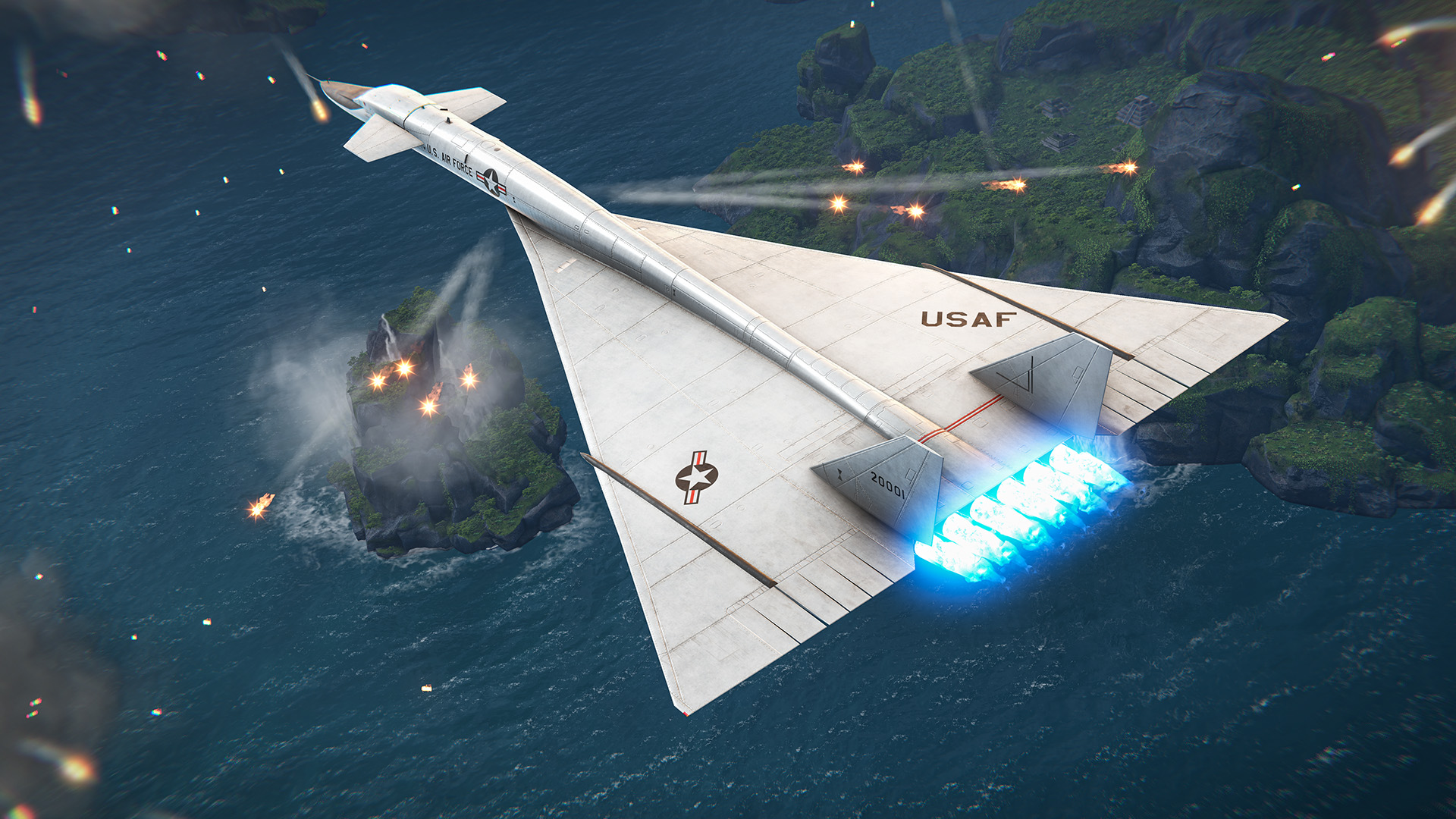 The famous prototype of the US supersonic deep-penetration strategic bomber. The aircraft features a canard configuration with a thin delta wing and twin vertical stabilizers, which, together with six turbojet engines, allows it to reach supersonic speeds. It carries XAGM-48A Skybolt nuclear missiles, designed for the priority destruction of surface targets at long ranges. It also carries two types of bombs: the AGM-62 Walleye II ERDL medium-range aerial bombs with a television guidance system, which are guided to targets beyond the pilot's line of sight, and the GBU-57B MOP heavy glide bombs with area damage. The "Valkyrie" bears its fearsome name for a reason — the combined firepower of this bomber will keep surface targets of any size at bay!