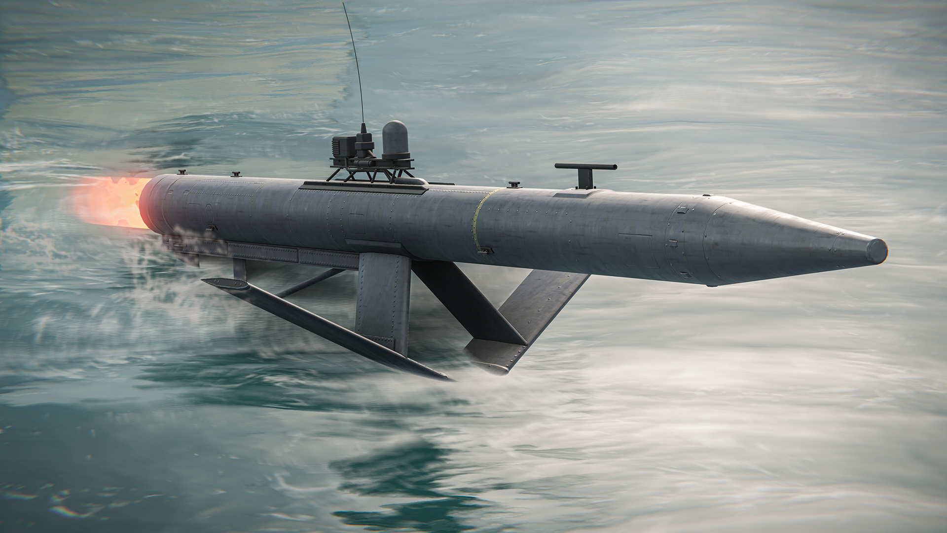 The main prize — Pan Spatial RAMSTORM 1. A concept of a streamlined unmanned wing-in-ground-effect vehicle. It moves at high speed but cannot turn quickly. It has a very powerful self-detonating charge capable of dealing devastating damage to any surface target. The automatic target-following mode engages at medium range, so launches should be planned in advance, with the optimal route chosen by the operator.