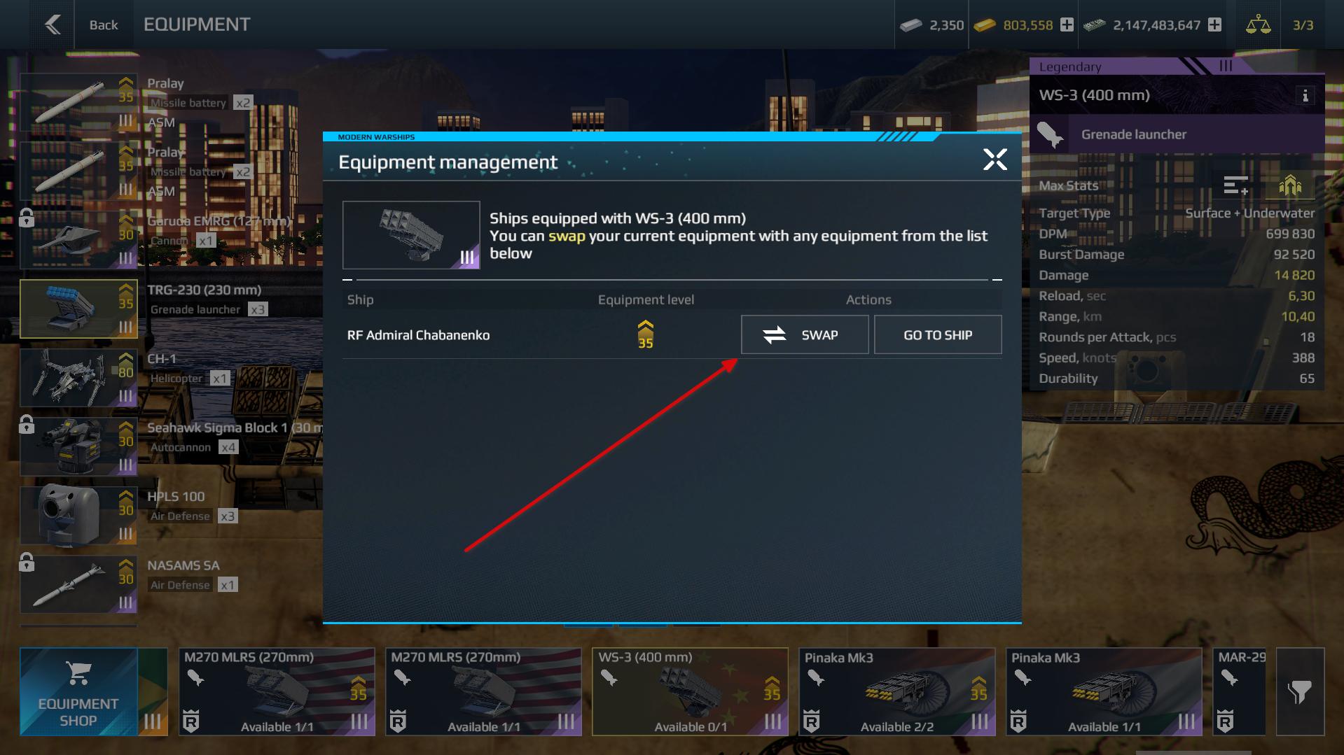 Select the equipment, click the magnifying glass icon, find the ship where it is installed, and press “Swap.” Done!