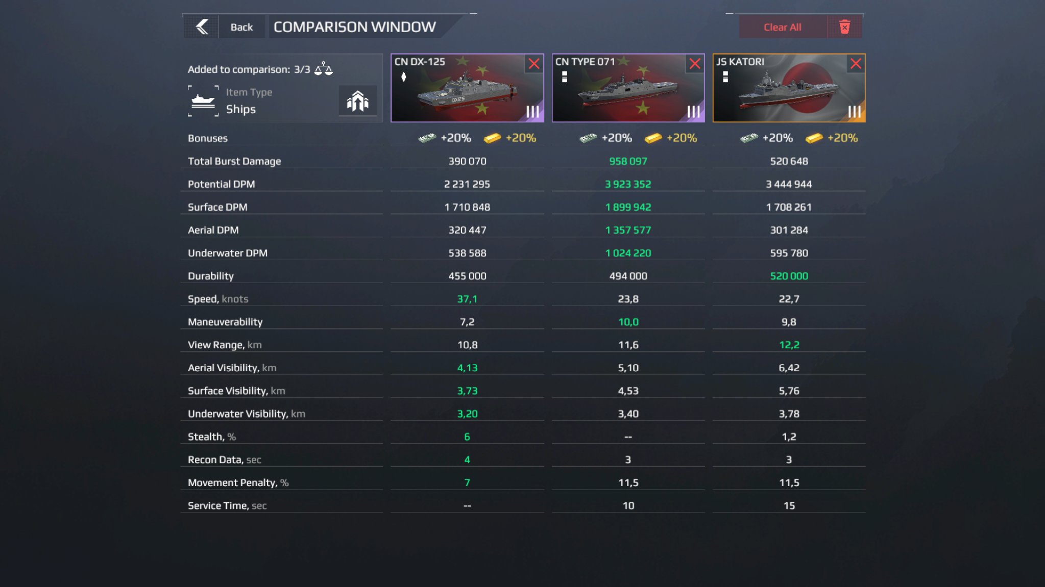 • Equipment can only be compared within the same type and tier. Ships of different classes can be compared to each other.